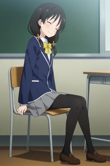 nonoka, long hair, black hair, low twintails, hair ornament, wispy bangs, closed eyes, long sleeves, blue jacket, white shirt, collared shirt, yellow bowtie, grey skirt, pleated skirt, black pantyhose, brown footwear, loafers