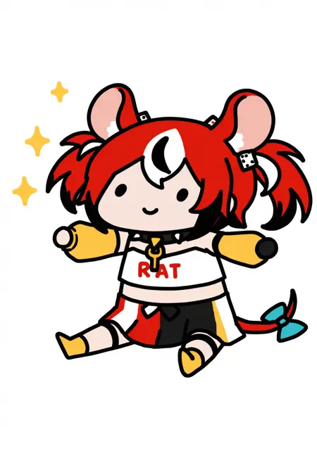 B4elzDef, 蓝色眼睛, 多色头发, 红发, 白发, 黑发, 不对称双马尾, 骰子发饰, 动物耳朵, 尾巴, 尾巴装饰, 带刺项圈, 钥匙项链, 无袖上衣, 白色上衣, 衣服文字, 分离式袖子, 不对称袖子, 双色袖子, 黄色袖子, 单只手套, 黑色手套, 露腹, 多色裙子, 大腿绑带