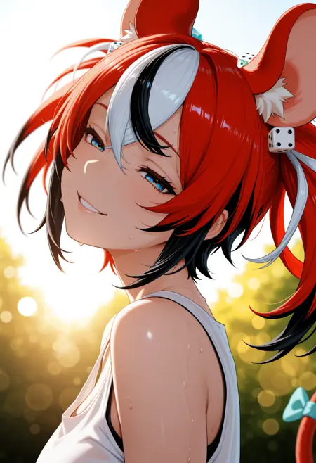 Hak0sB4elz, 蓝色眼睛, 多色头发, 红发, 白发, 黑发, 不对称双马尾, 骰子发饰, 动物耳朵, 尾巴, 尾巴装饰