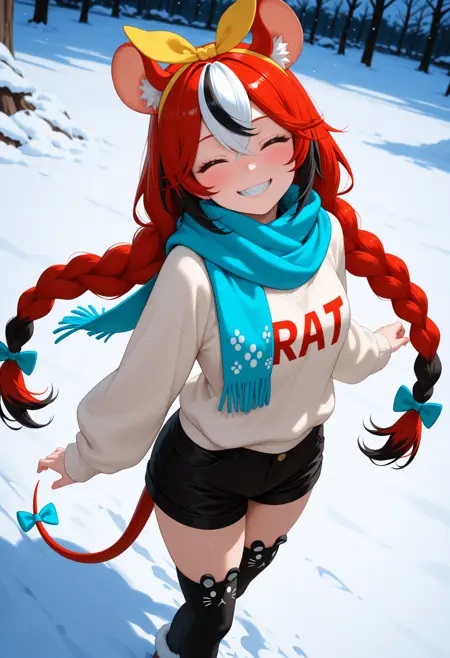 B4elzStrwbrry, 蓝色眼睛, 多色头发, 红发, 白发, 黑发, 非常长的头发, 低双辫子, 动物耳朵, 黄色蝴蝶结发带, 蓝色围巾, 白色毛衣, 衣服文字, 长袖, 黑色短裤, 黑色大腿袜, 动物耳朵腿饰, 尾巴, 尾巴装饰