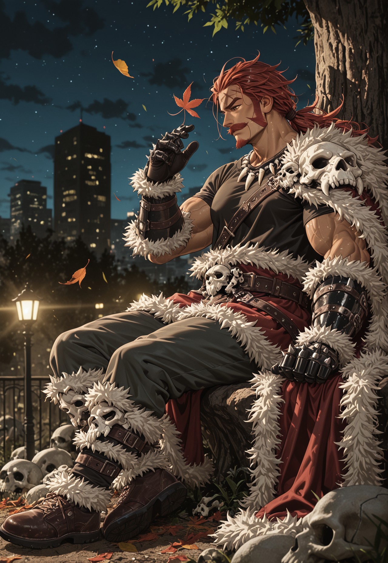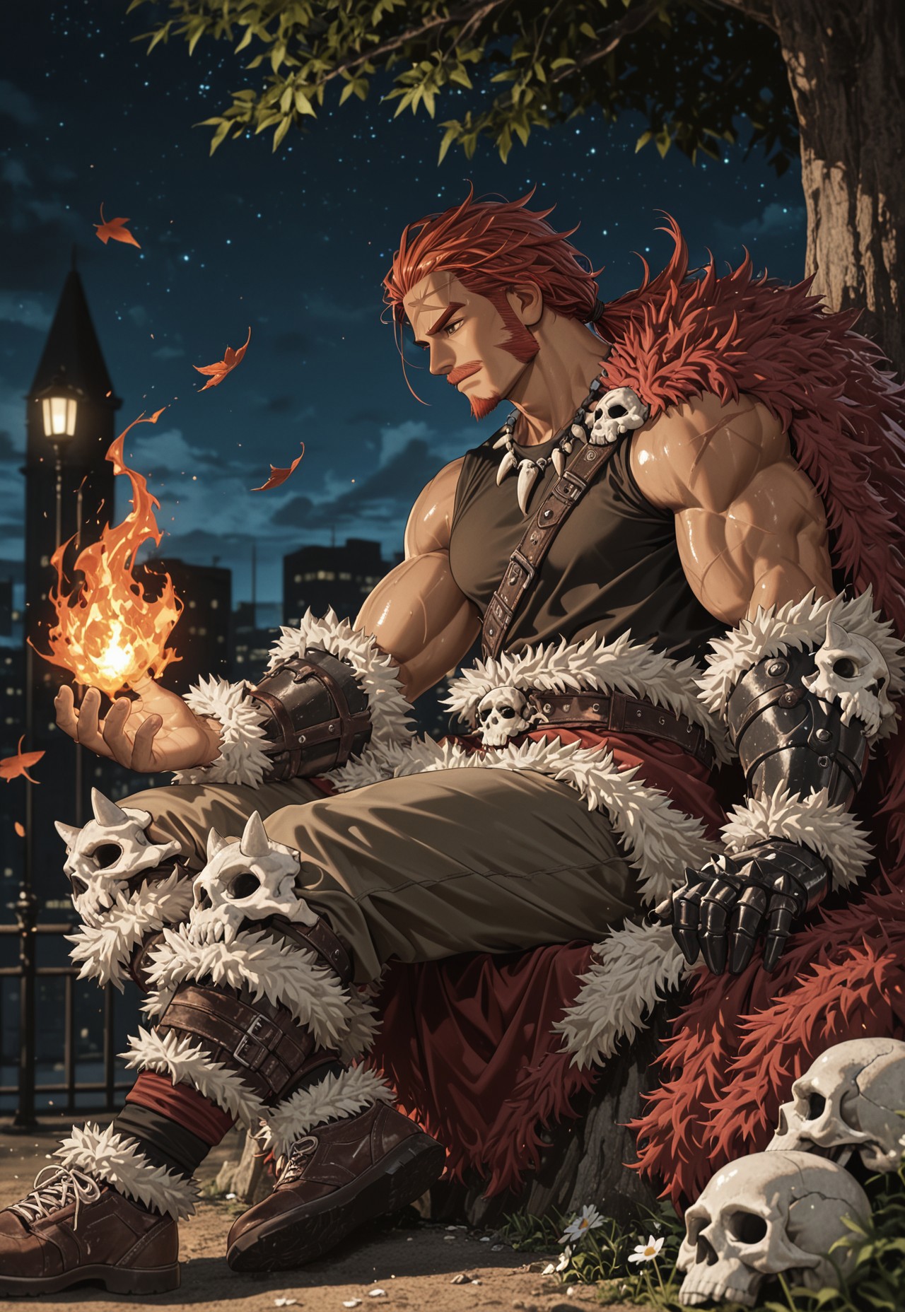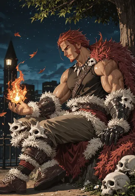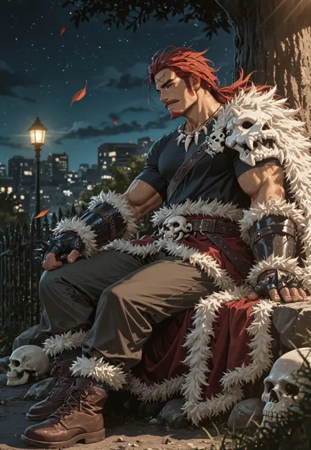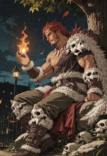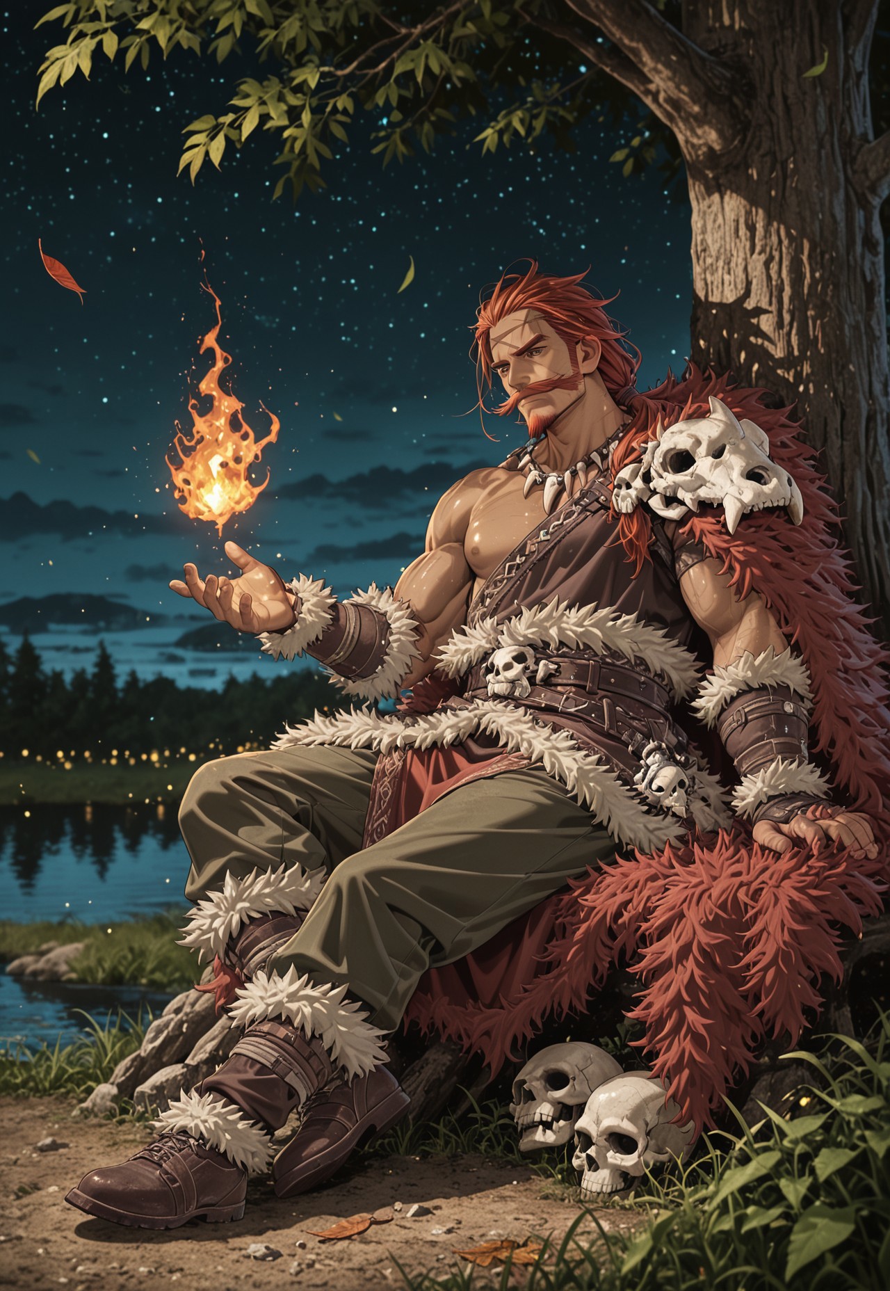 | Trained Words | fuu_brown eyes, fuu_red hair,Copied! 1boy, tied hair, long hair, sideburns, moustache, goatee, scar on forehead,Copied! solo, male focus, manly, mature male, bara, muscular male,Copied! tooth necklace, shirt, belt, skull, fur trim, hand guard, fur cape, waistcape, pants, socks, shoes,Copied! |