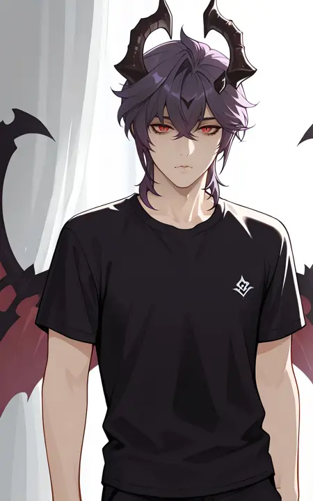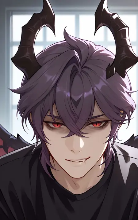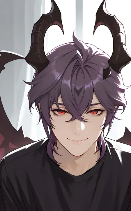 アクティベーションタグ: durin, 紫色の髪, 赤い目, 目の間の髪, ドラゴンの翼, ウルフカットの髪型, アホ毛, ドラゴンの角, 縦に細長い瞳, 額のマーク,