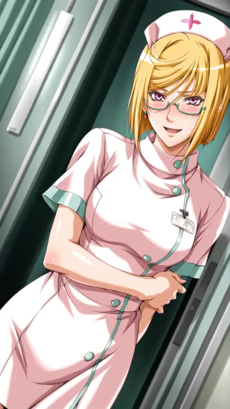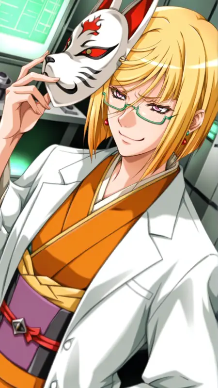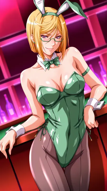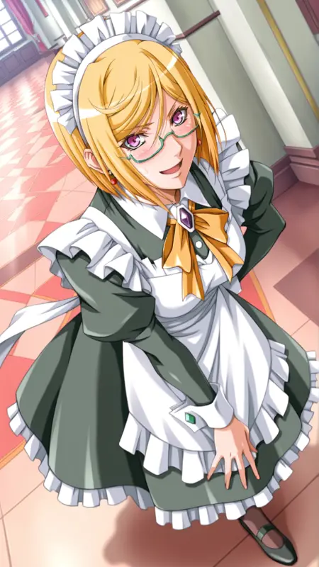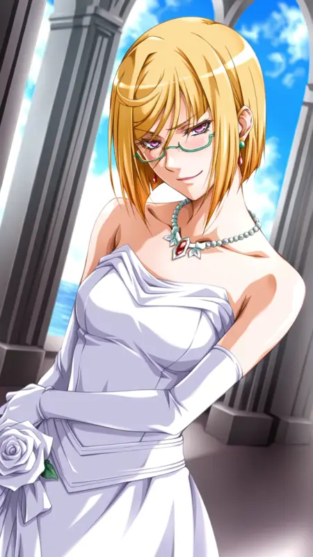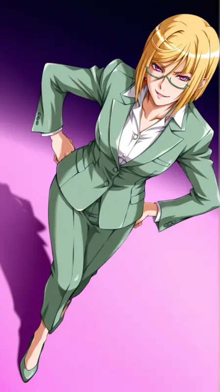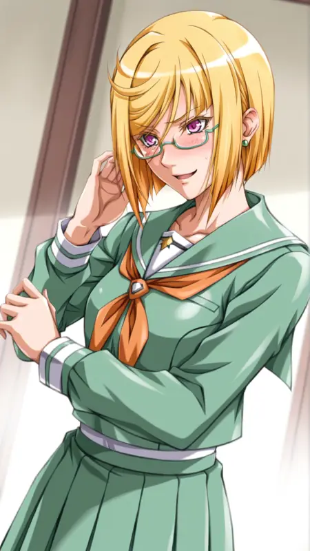 Appearance:blonde hair, purple eyes,bob cut,swept bangs, sidelocks, jewelry, earrings, green-framed eyewear, semi-rimless eyewear,