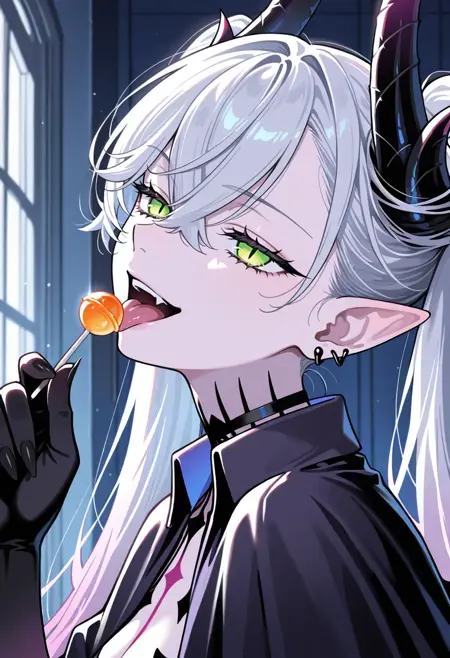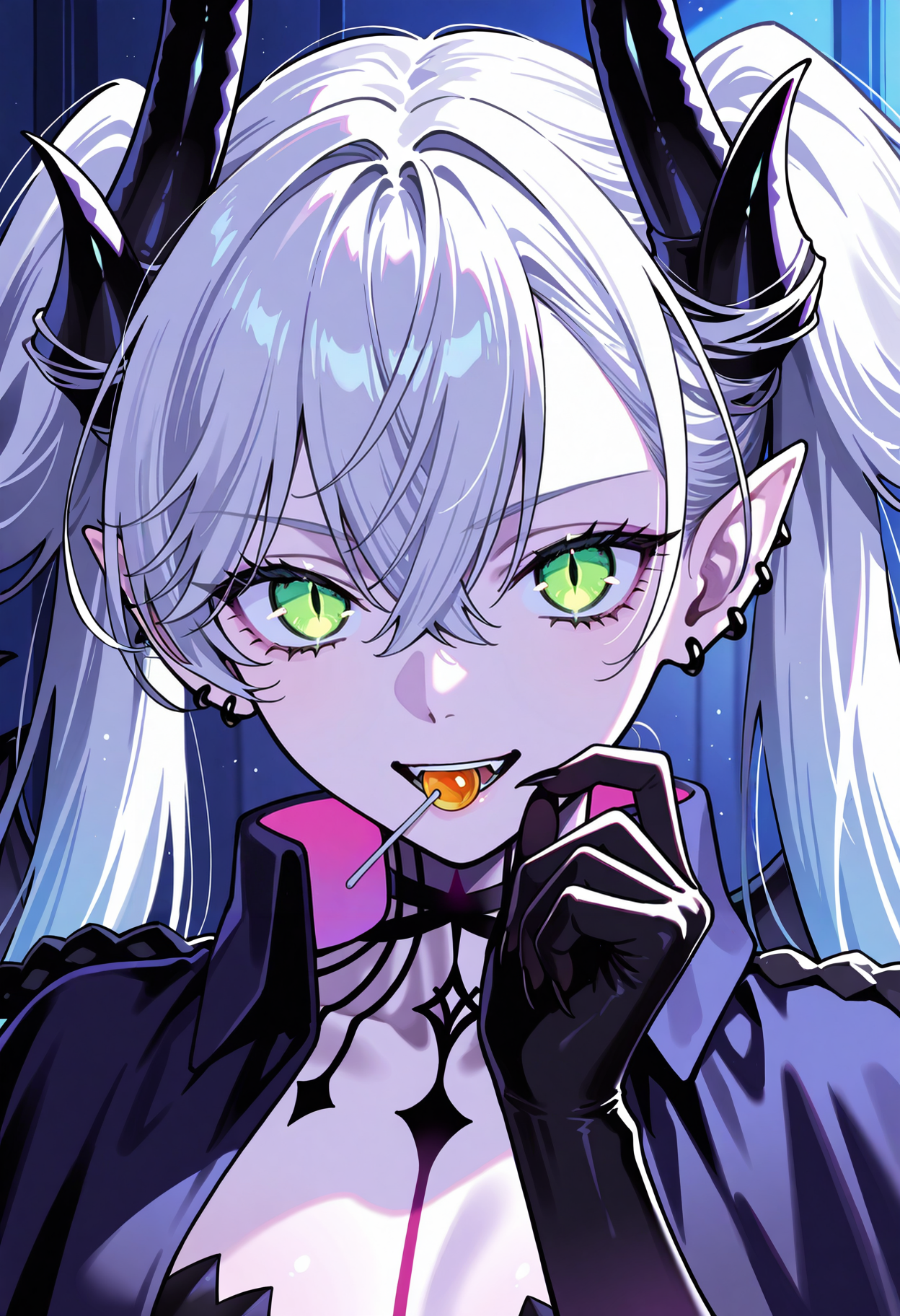 基础:fgolilith, 1girl, 复古艺术风格, 单人, 超长发, 双马尾, 白发, 渐变发色, 灰发, 发丝垂至眼睛间, 交叉刘海, 尖耳, 头发饰品, fgolilith恶魔角, 绿眼, 黑色项圈, 竖瞳, fgolilith斗篷, fgolilith身体纹身, fgolilith耳环, 彩色四肢, 黑色双手, 尖锐指甲, fgolilith蛇, fgolilith恶魔翅膀, fgolilith黑色过膝袜, 大腿绑带, 大腿靴, 中等胸部, 内衣, fgolilith黑色内裤, 黑色鞋履, fgolilith高跟鞋,
