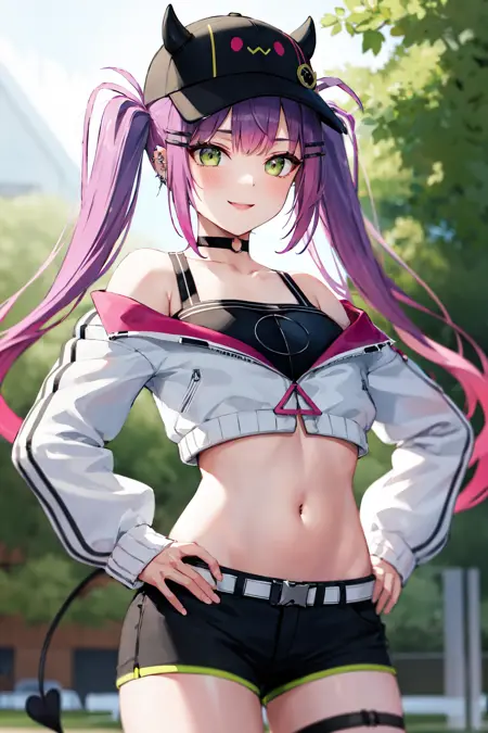 衣装1aatowa, 長髪, ツインテール, 黒い頭部装具, ベースボールキャップ, 偽の角, ヘアクリップ, ピアス, 悪魔の尾, 黒いチョーカー, 肩出し, クロップドジャケット, 白いジャケット, 長い袖, 腹出し, ベルト, 黒いショートパンツ, 短いショートパンツ, 片方の太ももハイ、フィッシュネット