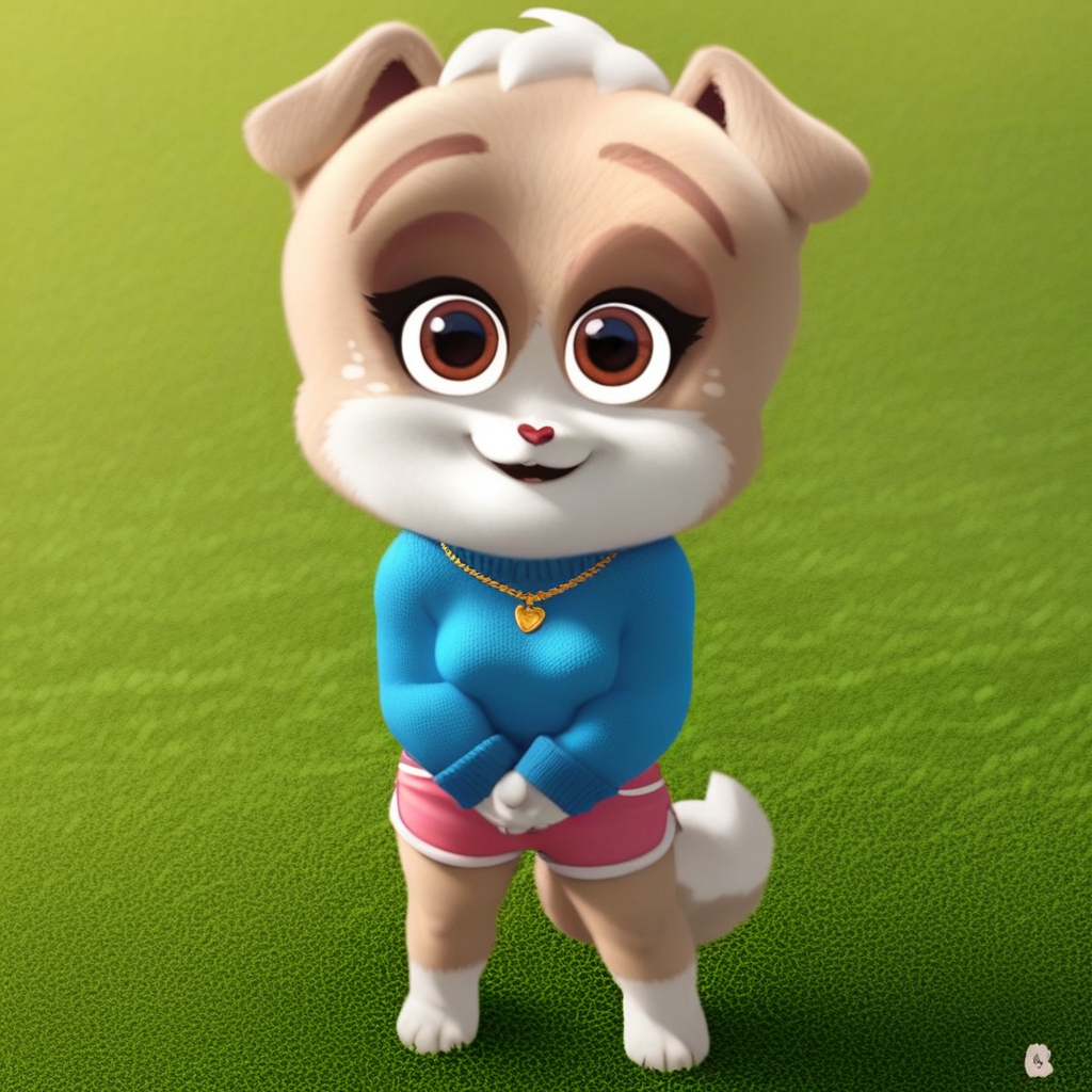 dog, pomeranian mix, light brown fur, white hair, brown eyes, red nose, dog ears, curly dog tail, blue sweater, pink collar, gold star dog tag,