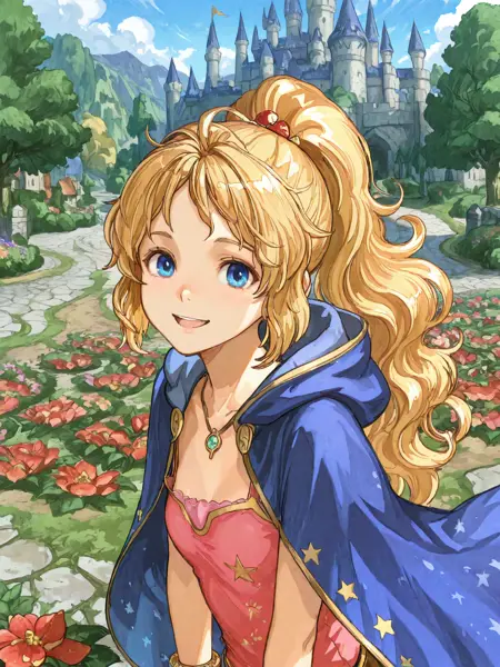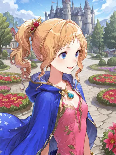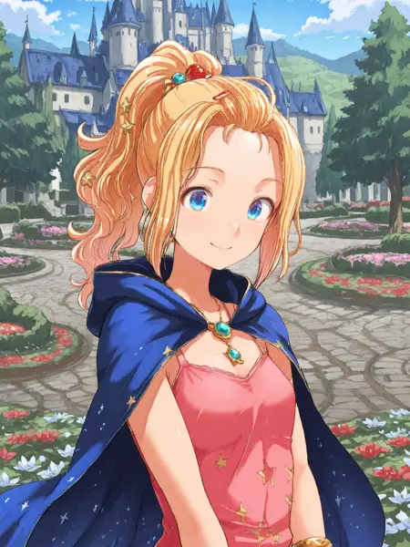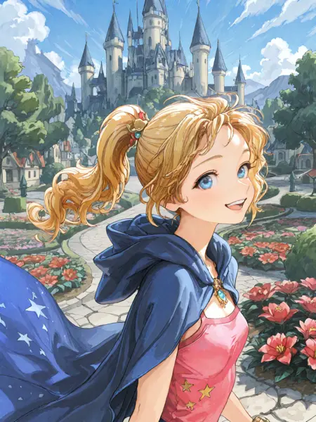 분홍 레오타드, 별 무늬, 후드 내린 상태, 파란 망토, 팔찌, 파란 사롱, 흰색 허벅지 스타킹