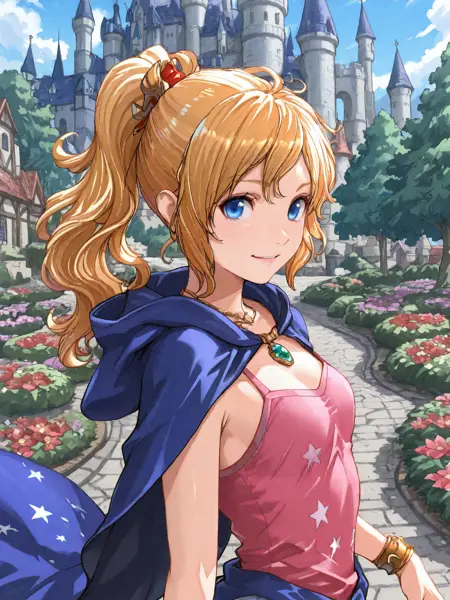 粉红色紧身衣,星星图案,兜帽下垂,蓝色斗篷,手镯,蓝色纱笼,白色过膝袜