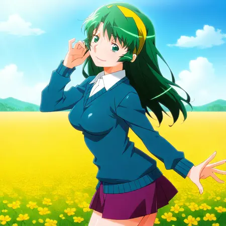 MAIN: 1girl, shouko_srm, 緑髪, 長髪, ヘアバンド, 黄色のヘアバンド, 緑の目, 中程度のバスト,