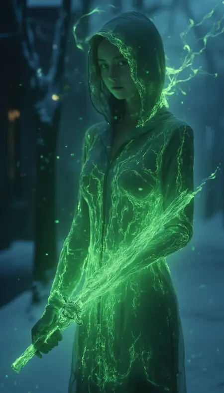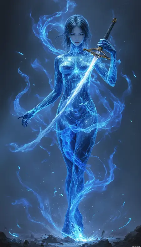 推荐句:A girl made entirely of flames stands,composed of fire elements,fire element,