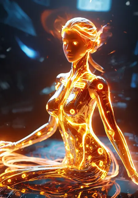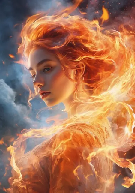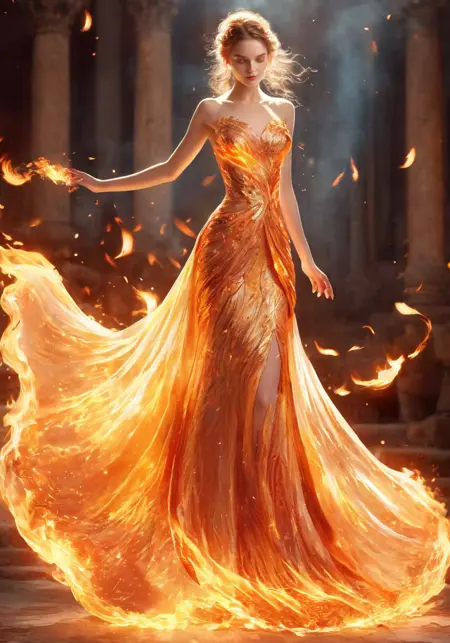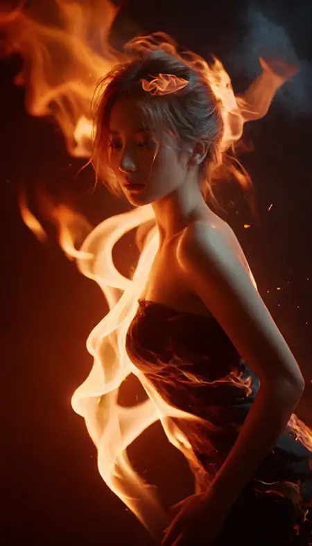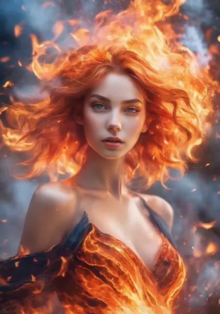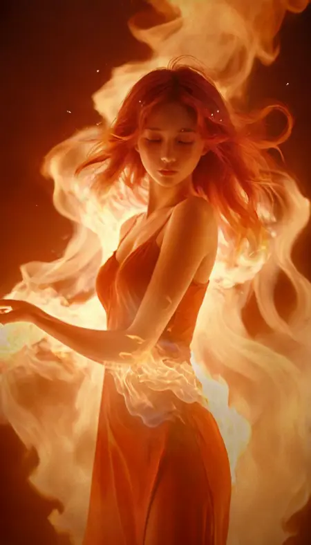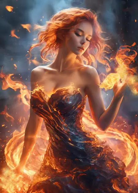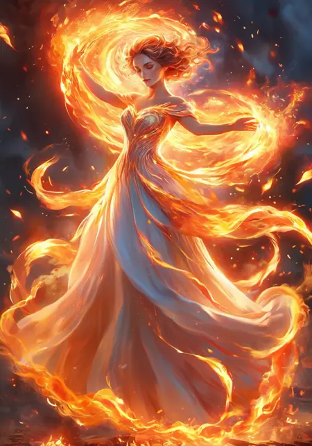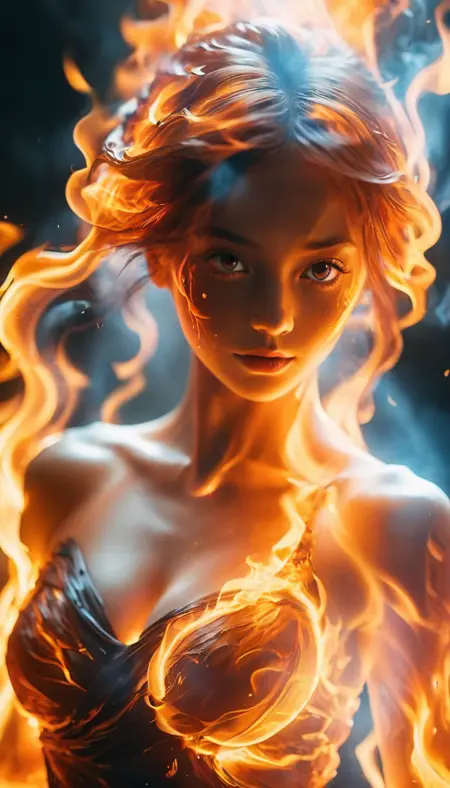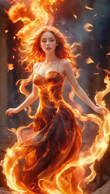 - 推荐提示:A girl made entirely of flames stands, composed of fire elements, fire element