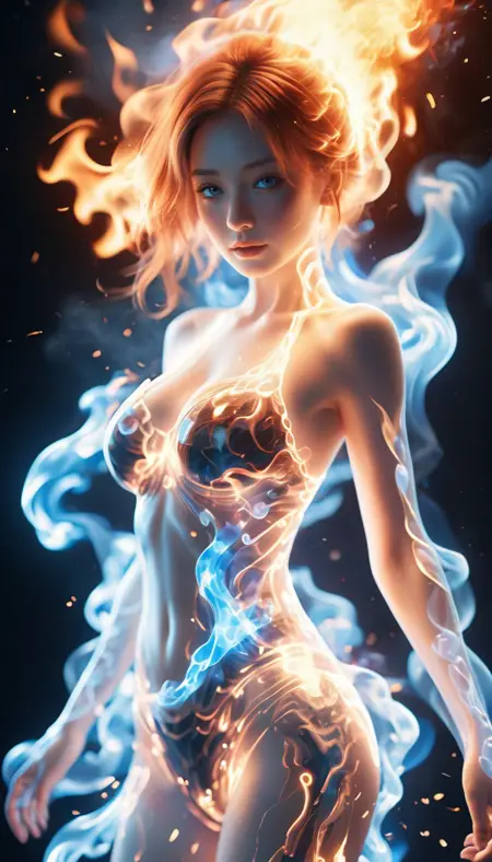 推荐提示:A girl made entirely of flames stands, composed of fire elements, fire element