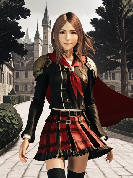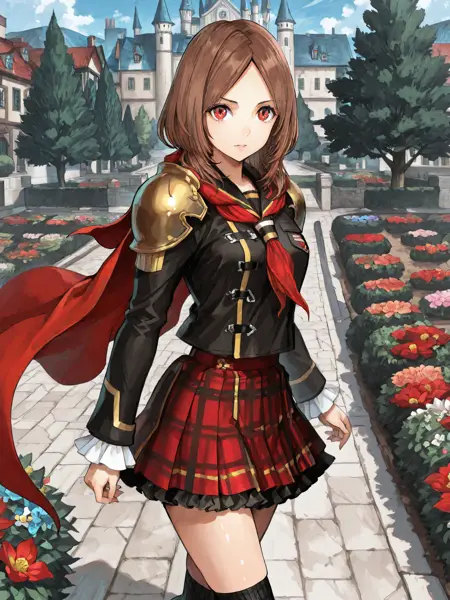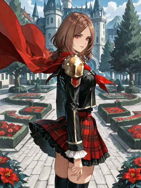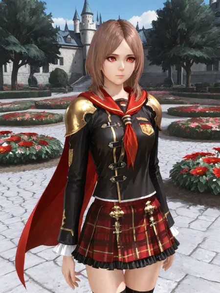 lcierem、赤い目、光る目、茶色の髪、ミディアムヘア、分け目のある髪、クラスゼロ制服、学校制服、黒いシャツ、ゴールドの肩パッド、赤いネッカチーフ、赤いマント、長い袖、赤いスカート、チェック柄スカート、フリル付きスカート、黒い脚着
