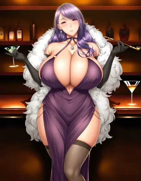 보라색 드레스, 할터 드레스, 초커, O링, 검은 허벅지 스타킹, 팔꿈치 장갑, 검은 장갑, 옆 슬릿, 깃털 스카프, 하이힐, 검은 신발