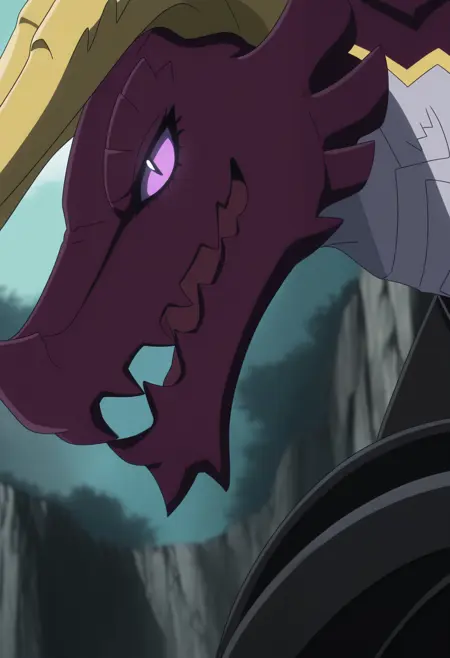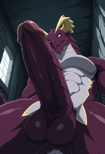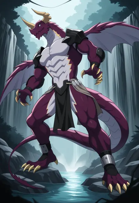 メイン衣装: 黒い肩当て、黒い腕輪、ドラゴンの翼、腰巻き、太もも当て、足首の輪