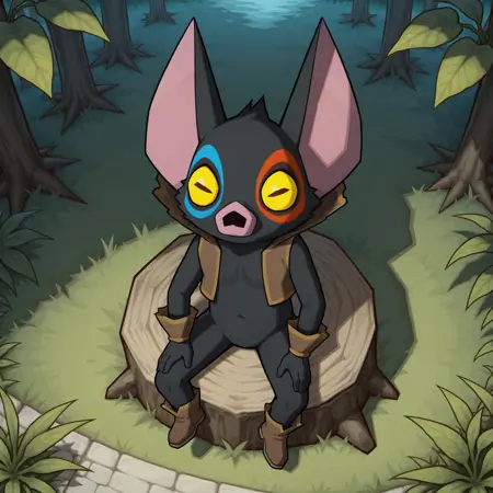 标签: 男性、蝙蝠、黑色身体、黑色毛发、粉红色耳内、大耳朵、黄色眼白、黑色瞳孔、水平瞳孔、棕色背心、敞开的背心、棕色腕带、棕色靴子、瘦削