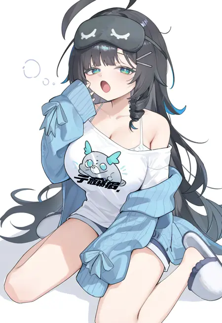 jimengchaopaj,sleep mask,hairclip,blue cardigan,white bra,white shirt,print shirt,blue shorts,white slippers,off-shoulder shirt,sleeves past wrists