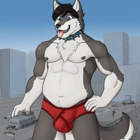 macro, husky, anthropomorphic, red underwear, city, black hair, muscular
