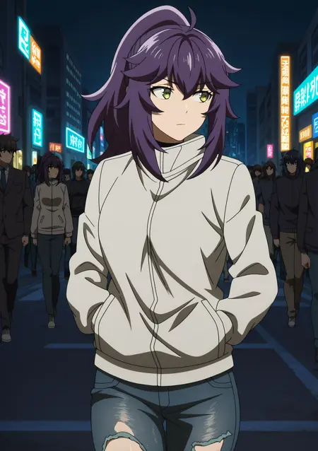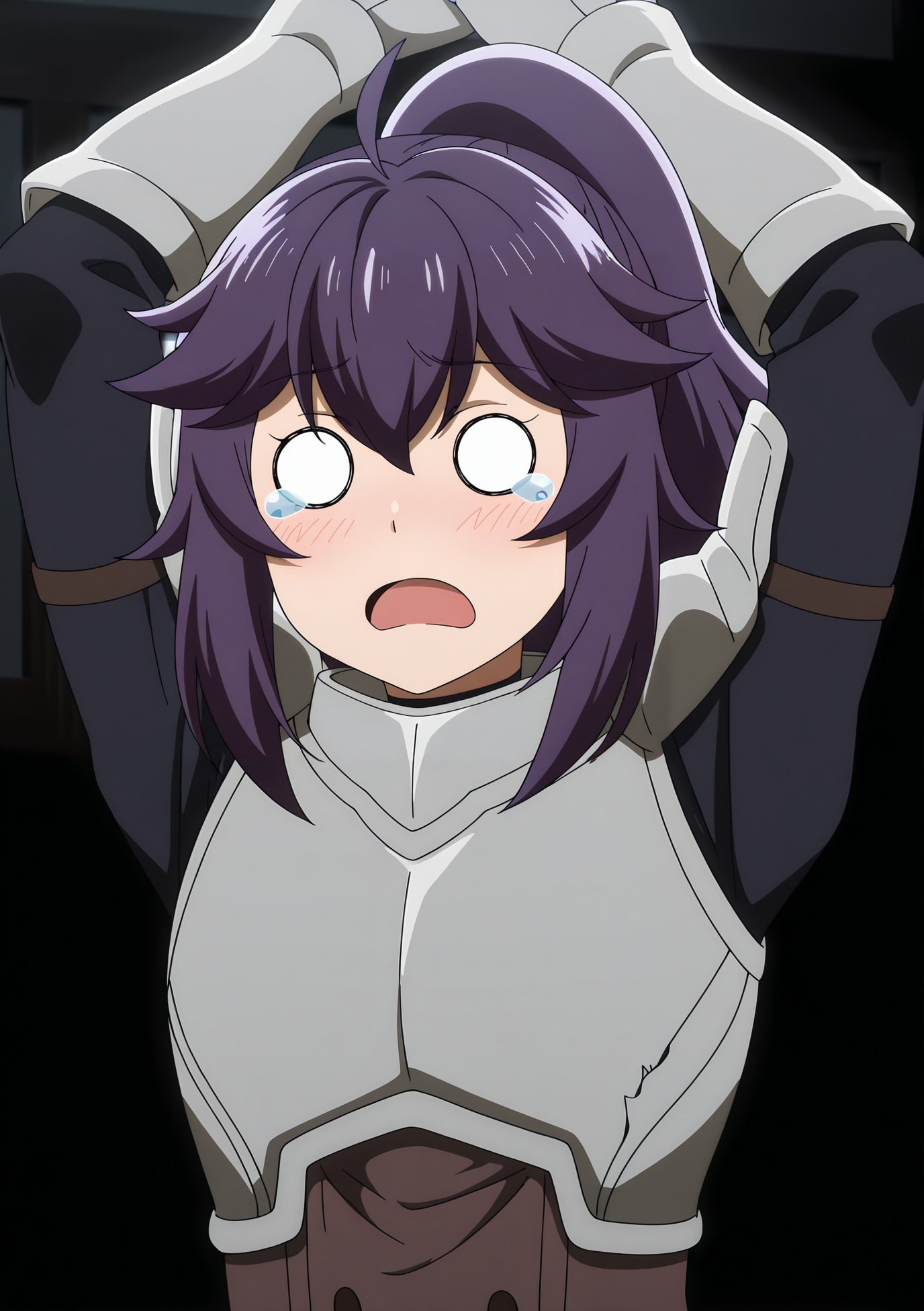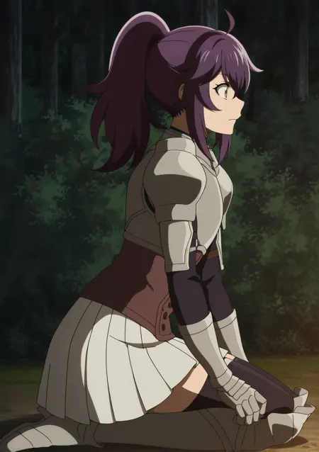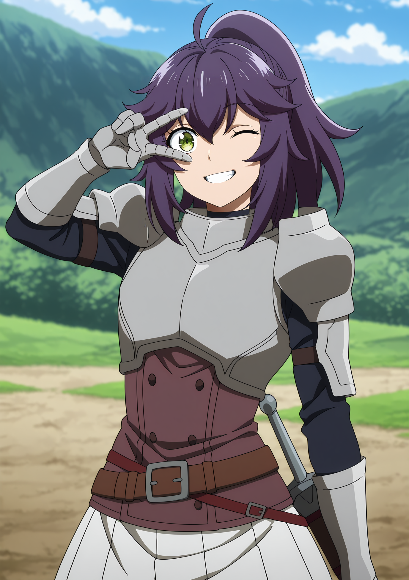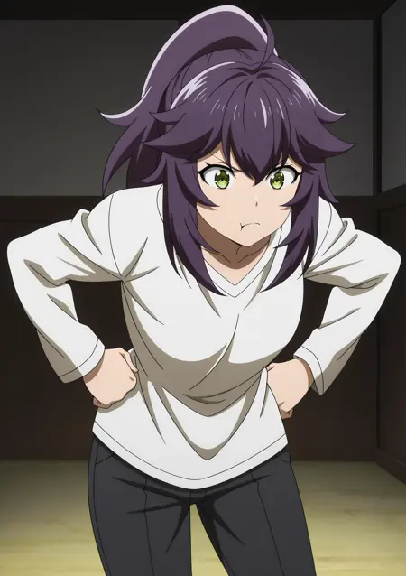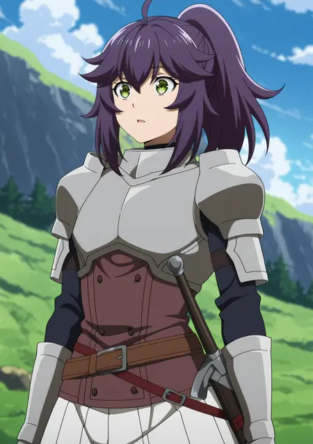 Aul, ponytail, solo, purple hair, long hair, green eyes, bangs, sidelocks, ahoge