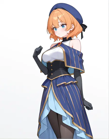 Prompt: Rain-Liver020, 1girl, solo, blonde hair, orange hair, short hair, blue eyes, blue dress, elbow gloves, capelet, bare shoulders, beret, hat ribbon, red brooch, white shirt, light blue skirt, long skirt, black pantyhose, medium breasts, black gloves, blue beret, blue headwear, ribbon, bangs, black corset, light blue loose skirt, loose skirt, striped clothes
