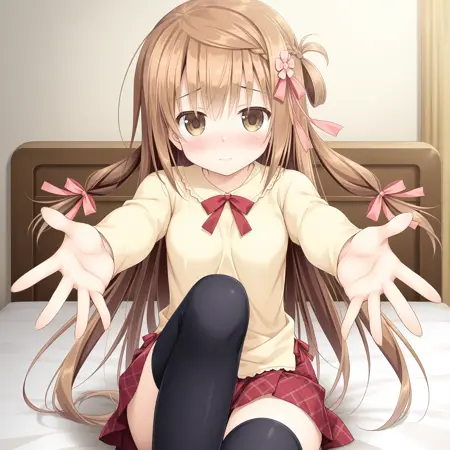 black thighhighs,long sleeves,pleated skirt,plaid skirt,red skirt,miniskirt,light yellow shirt,red bow,red bowtie,