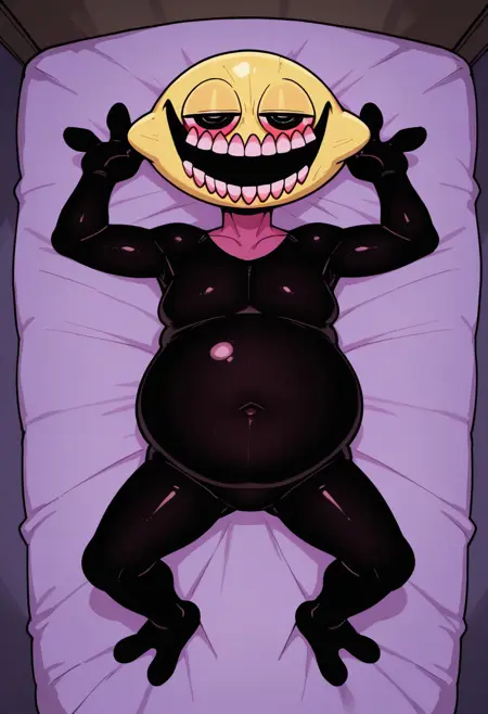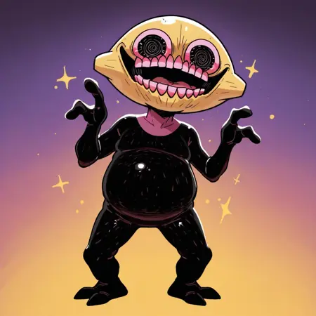 标签:Monster_fnf,怪物,恶魔,柠檬形状的头,黄色的头,紫粉色的脖子,黑色身体,黑色皮肤,有纹理的身体,每只手两个手指,每只脚两个脚趾,血丝眼,露出牙齿,牙齿,大眼睛,大瞳孔,圆润