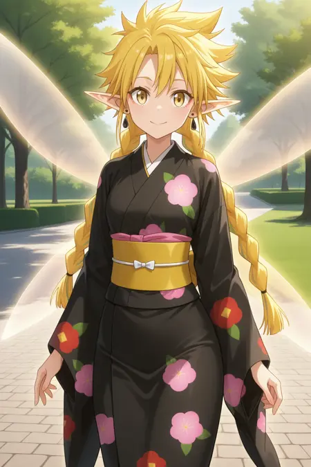 aaramiris, fairy, fairy wings, pointy ears, yellow eyes, blonde hair, streaked hair, spiked hair, twin braids, earrings, japanese clothes, black kimono, food print,