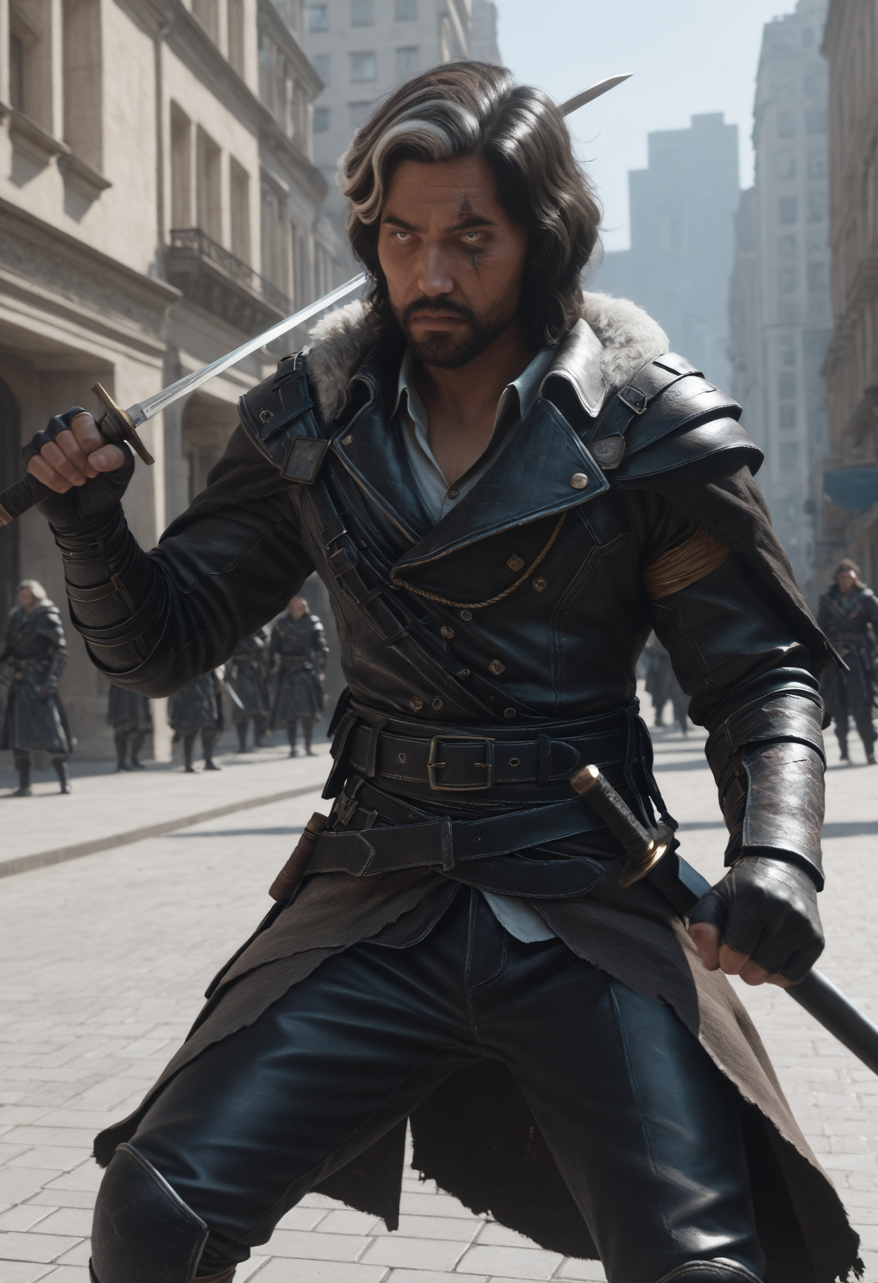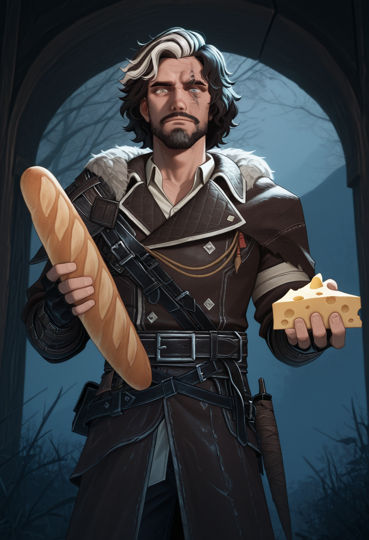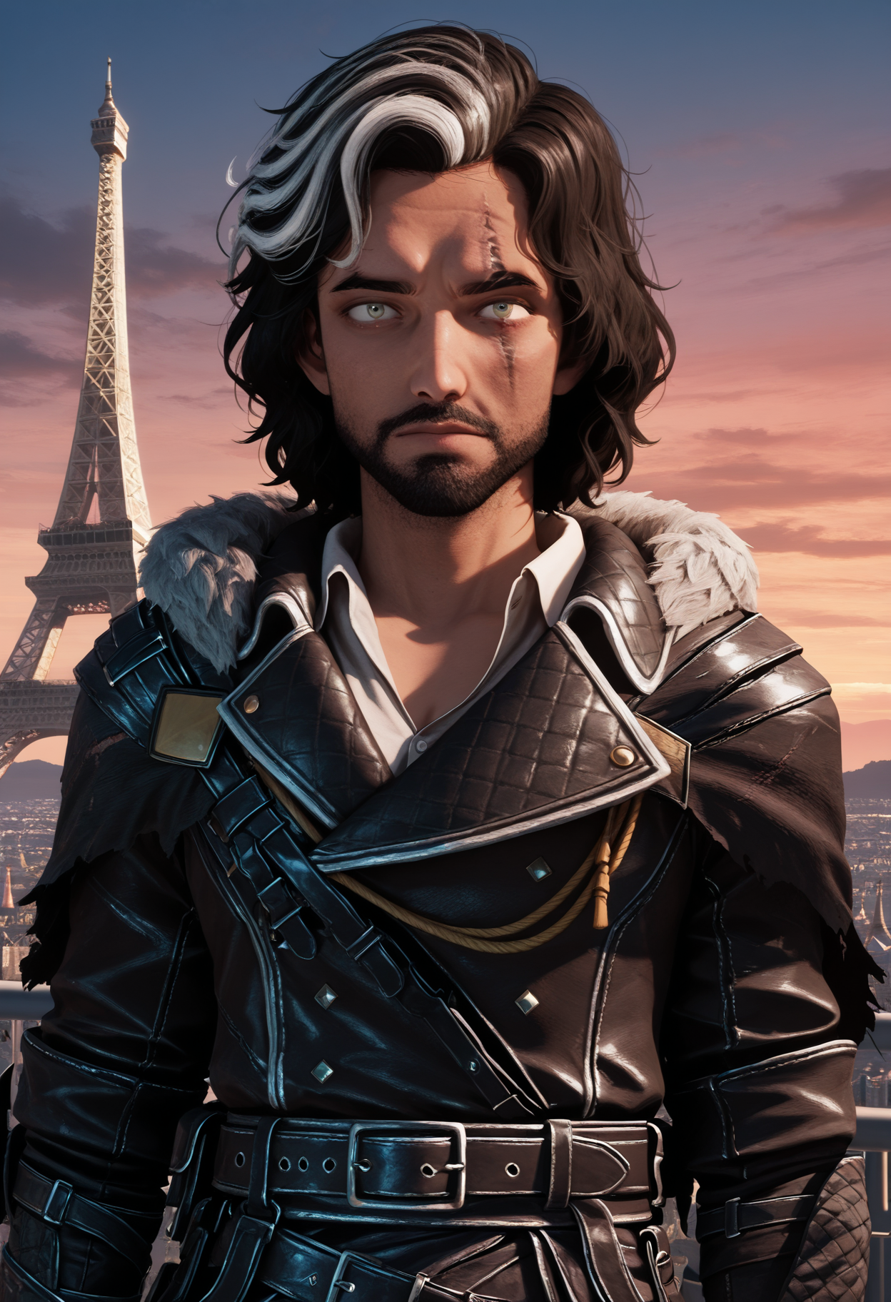 The outfit is "fur trim, leather armor, belt, pants, boots"