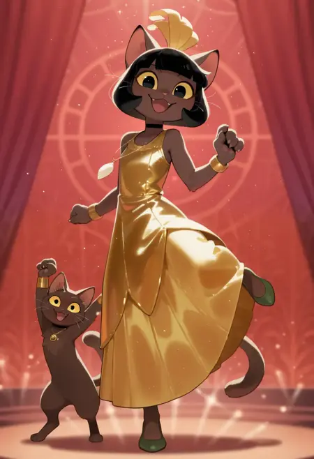 노란 드레스: on model, screencap, flat color, ivyc, 1girl, female, solo, young, black eyes, yellow sclera, brown fur, brown hair, long hair, bangs, earlocks, cat, tail, yellow dress, yellow hairbow, red bow, grey socks, grey gaiters, black shoes, furry, anthro,