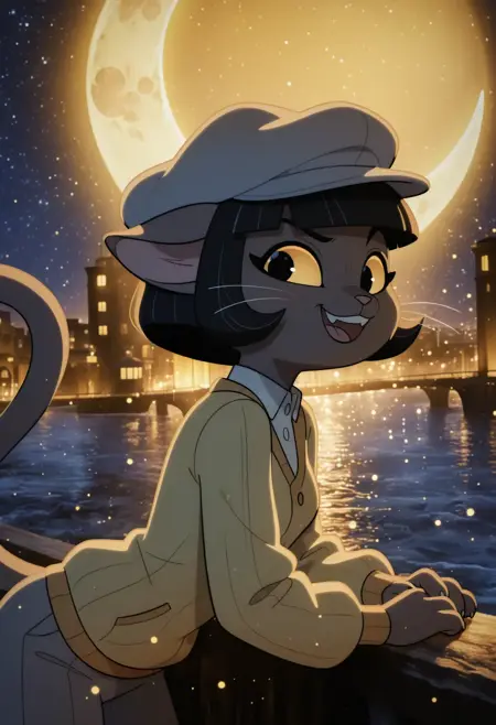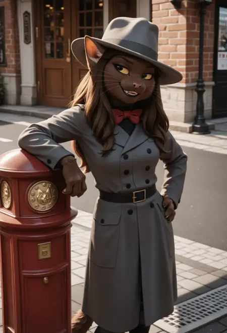默认服装:on model, screencap, flat color, ivyc, 1girl, female, solo, black eyes, yellow sclera, brown fur, black hair, short hair, bob cut, cat, tail, flat cap, grey flat cap, yellow cardigan, white button_up shirt, grey pants, short pants, plaid socks, brown shoes, furry, anthro,