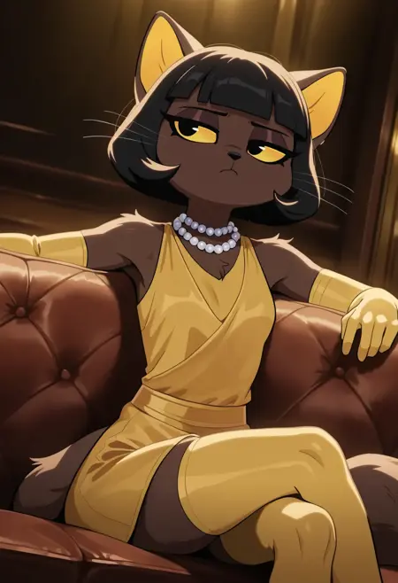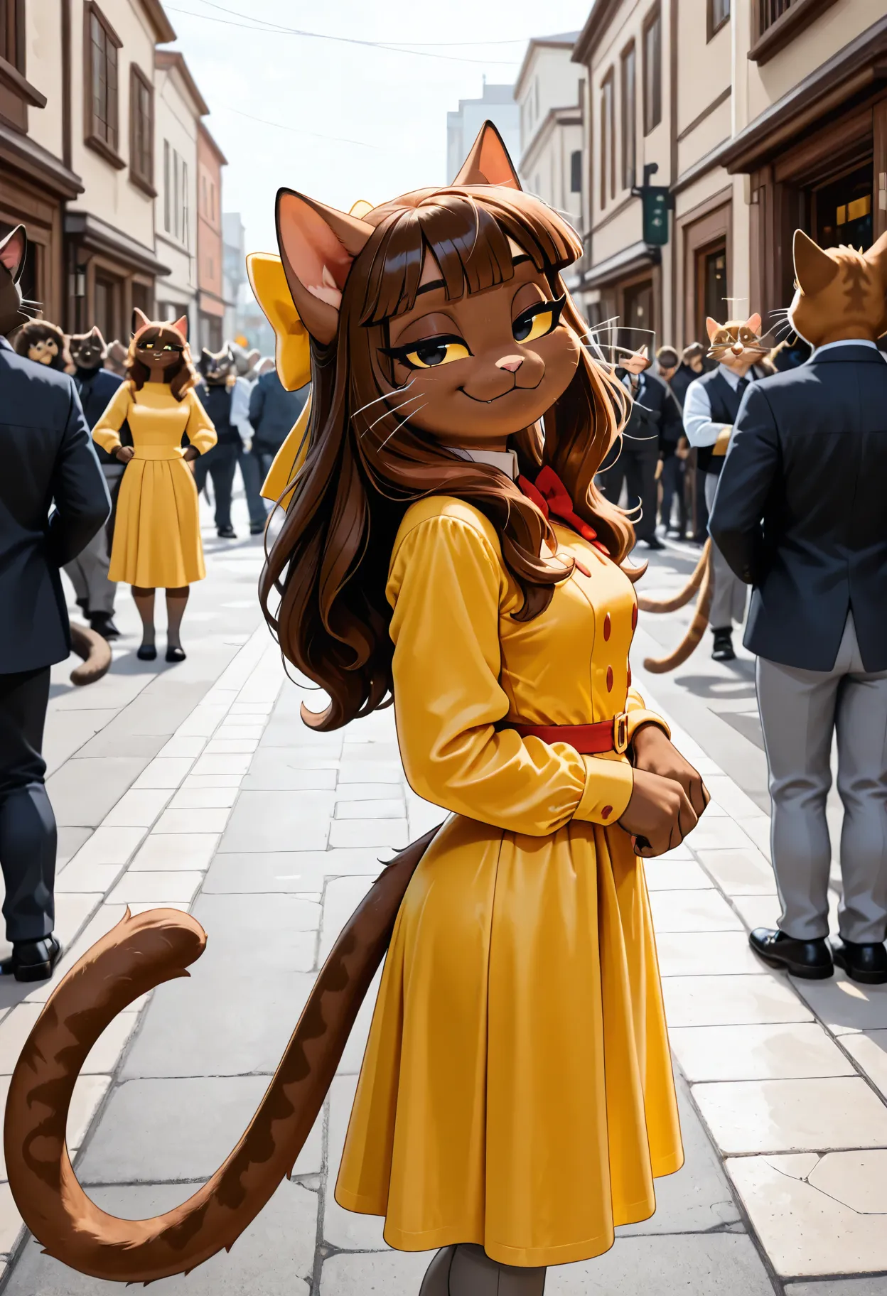 黄色连衣裙:on model, screencap, flat color, ivyc, 1girl, female, solo, young, black eyes, yellow sclera, brown fur, brown hair, long hair, bangs, earlocks, cat, tail, yellow dress, yellow hairbow, red bow, grey socks, grey gaiters, black shoes, furry, anthro,