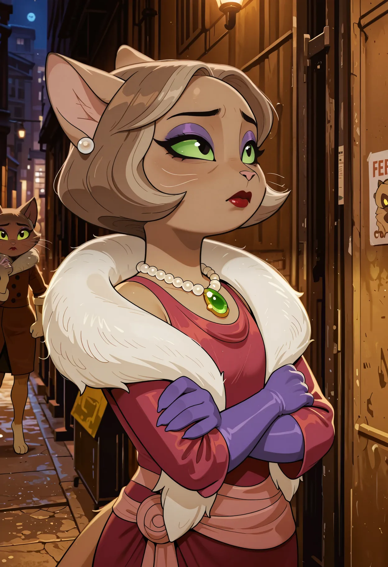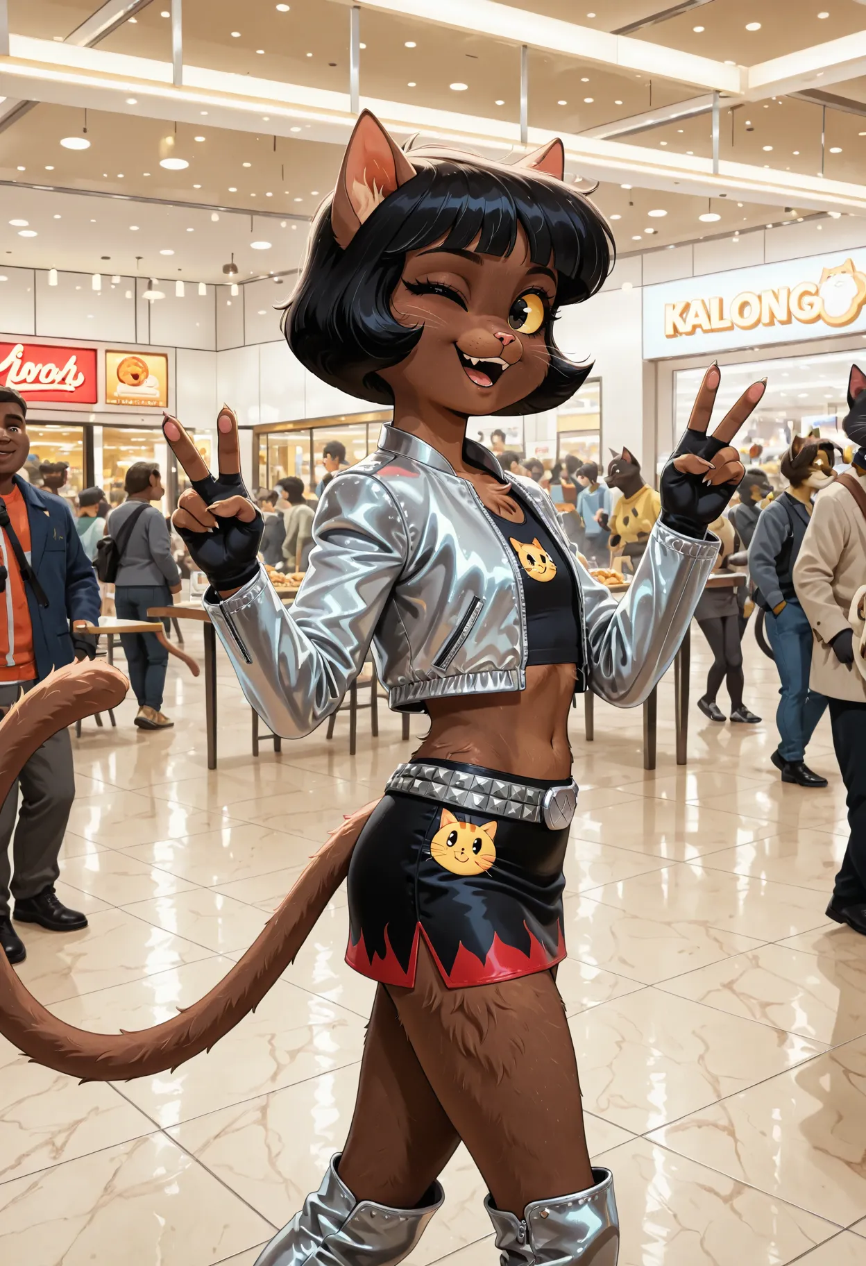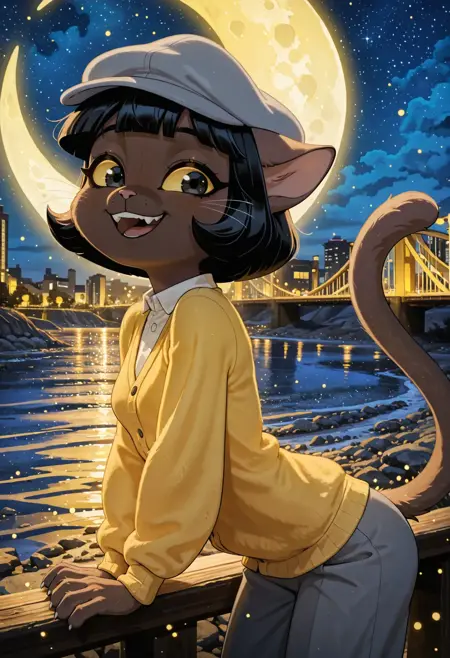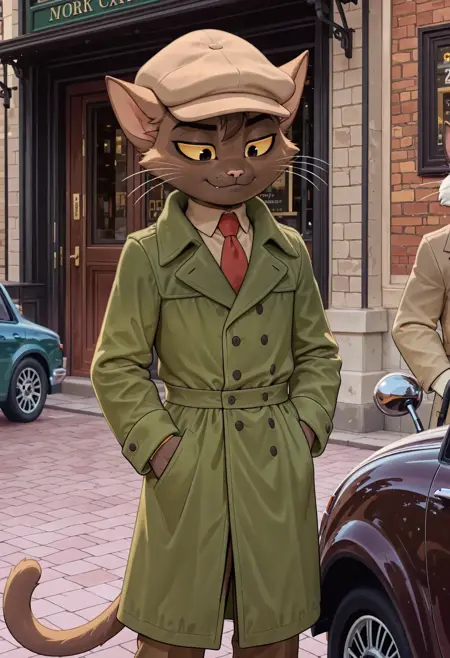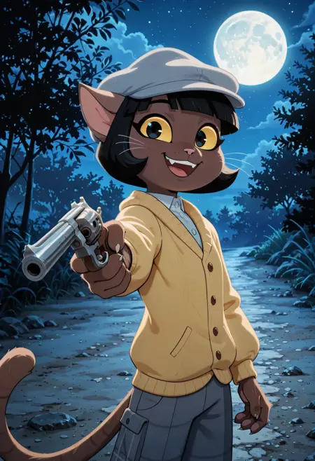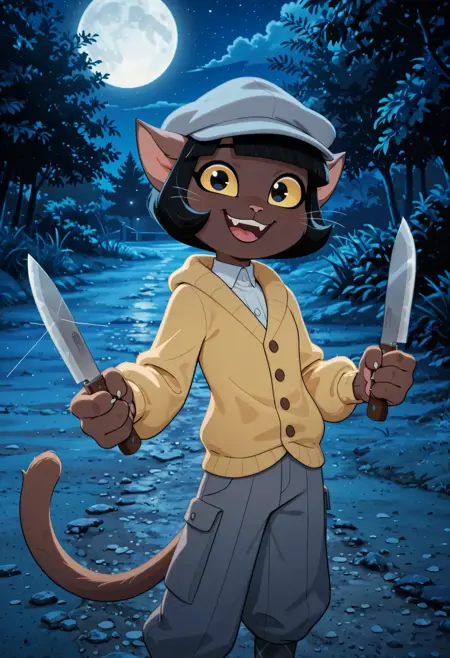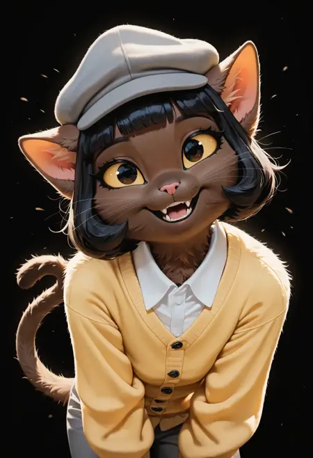 默认服装:on model, screencap, flat color, ivyc, 1girl, female, solo, black eyes, yellow sclera, brown fur, black hair, short hair, bob cut, cat, tail, flat cap, grey flat cap, yellow cardigan, white button_up shirt, grey pants, short pants, plaid socks, brown shoes, furry, anthro,