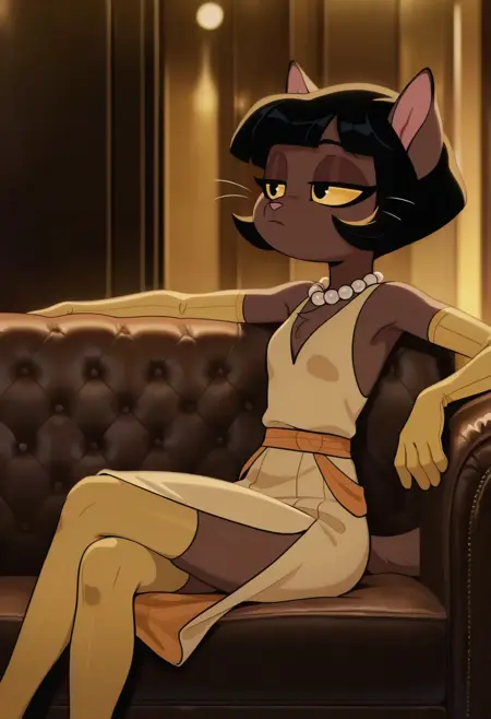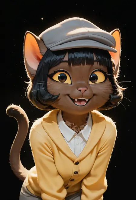 Default Outfit: on model, screencap, flat color, ivyc, 1girl, female, solo, black eyes, yellow sclera, brown fur, black hair, short hair, bob cut, cat, tail, flat cap, grey flat cap, yellow cardigan, white button_up shirt, grey pants, short pants, plaid socks, brown shoes, furry, anthro,