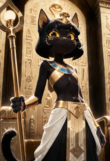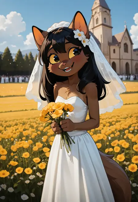 Yellow Dress: on model, screencap, flat color, ivyc, 1girl, female, solo, young, black eyes, yellow sclera, brown fur, brown hair, long hair, bangs, earlocks, cat, tail, yellow dress, yellow hairbow, red bow, grey socks, grey gaiters, black shoes, furry, anthro,