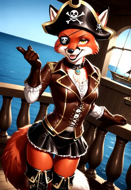 lora:Beatrice_Rose_Thistlewood_The_fox_pirate:1, def beatrice, canid, canine, mammal, red fox, red fox tail, detailed fur, bald, red fur, anthro female, anthro, black nose, white sclera, yellow eyes, eyepatch, one eye covered by eyepatch, 1girl, furry,