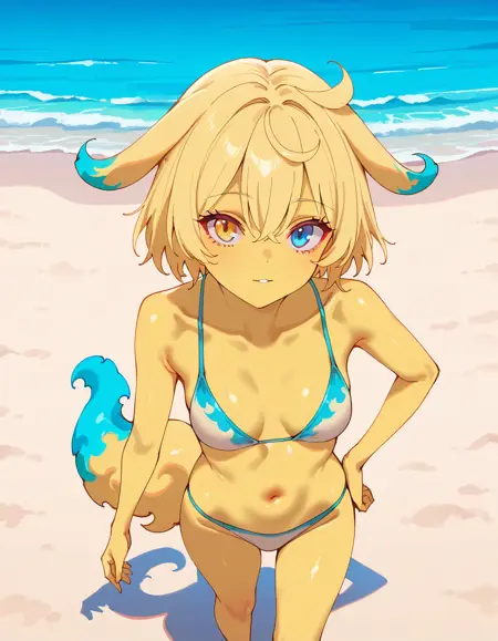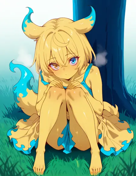 ChikeFl4re, Yellow Skin, Yellow Hair, Heterochromia, Yellow Blue Eyes, blue flames, yellow dress, animal ears, tail, 1girl