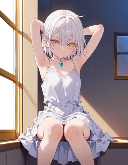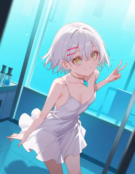 Fl4re, white hair, white dress, necklace, medium hair, yellow eyes, hairclip 1girl