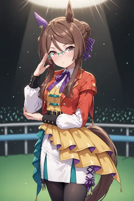 馬の耳、馬の娘、馬の尾、眼鏡、緑枠の眼鏡、茶色の髪、目の間の髪、赤い目、髪の結び目、長い髪、非常に長い髪、