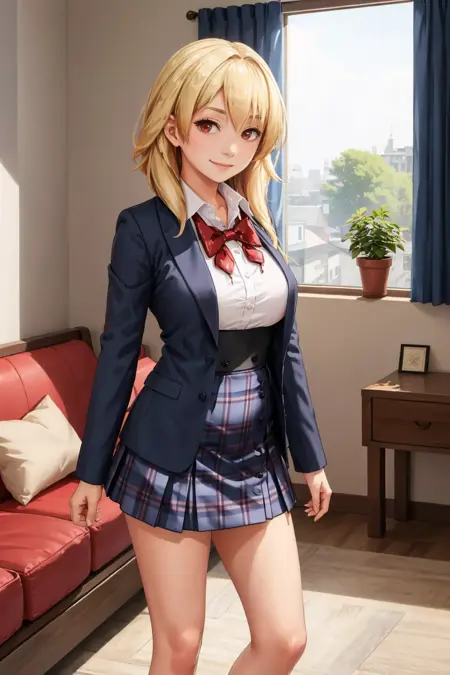 添加 "领结、白衬衫、西装外套、格子裙" 以呈现她的校服。
