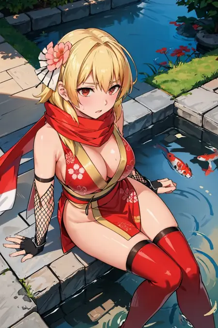 添加 "发饰花、红围巾、红色和服、花卉图案、露肩、渔网袜、无指手套、过膝袜" 以呈现她的忍者装束。