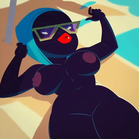 StudioKillers_Jenny, 1girl, Solo, colored skin, black skin, Big breast, red lips, white eyes, blue bikini, hood, sunglasses,