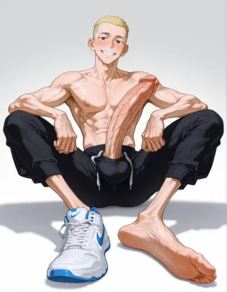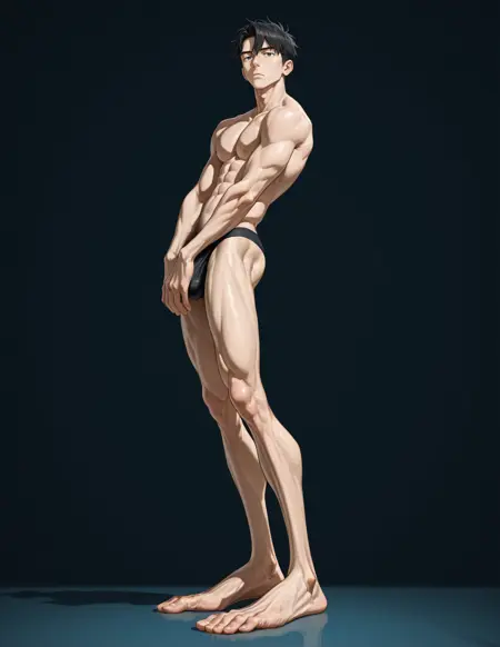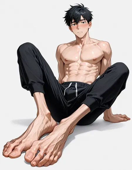 • gninf, big feet, long feet, feet, male focus, 1boy, barefoot, toes, veins, foot focus, pants, solo, indoors