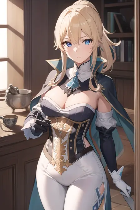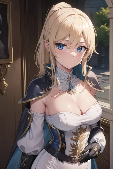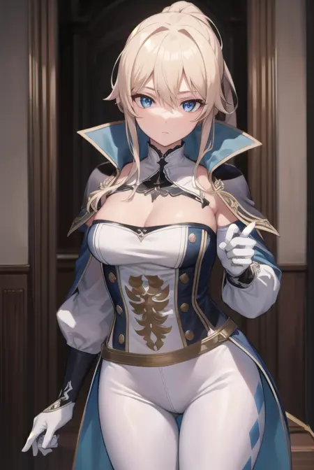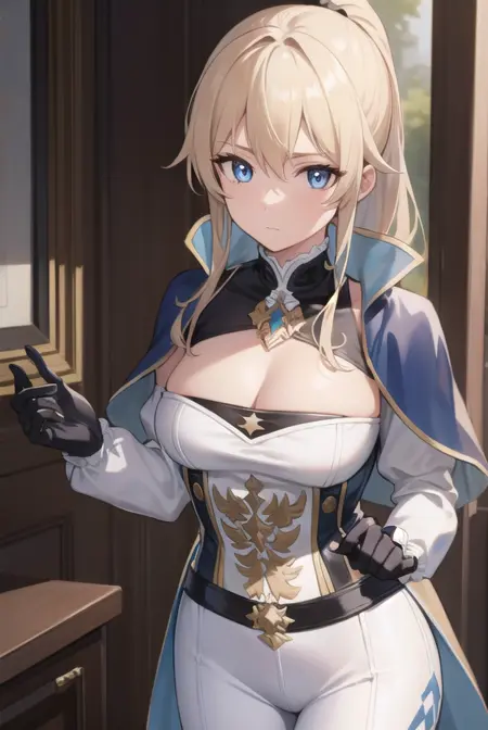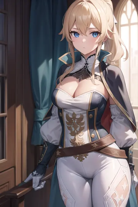 jean, blonde hair, blue eyes, hair between eyes, medium hair, ponytail,