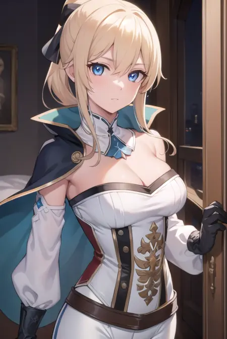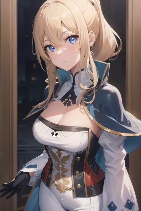 black gloves, blue capelet, capelet, cleavage, corset, detached sleeves, gloves, pants, strapless, (white pants:1.5),