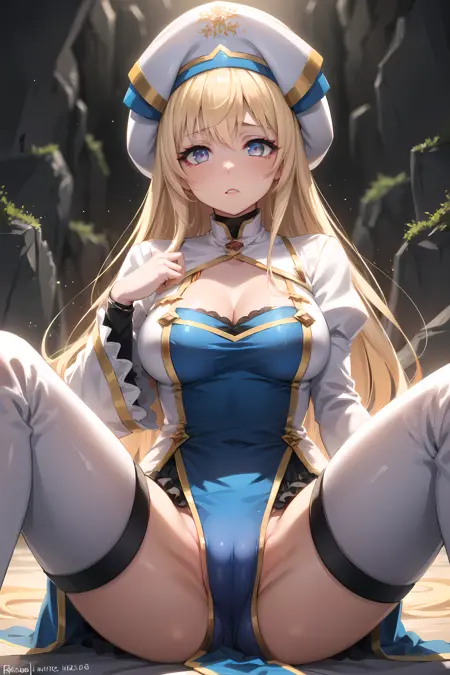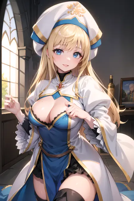 ,hat, long sleeves,dress,thighhighs, white headwear, thigh boots, wide sleeves, white thighhighs,