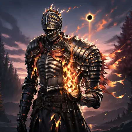 souls of cinder, armor, fire, solo, cape, helmet, embers, gauntlets, 1boy, torn cape, full armor, torn clothes, shoulder armor, male focus,