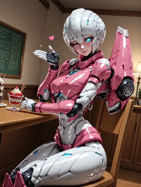 - furaiarcee\(transformers\), 1girl, mecha, robot, autobots, blue eye, glowing eye, no pupils, breasts, solo, no humans, science fiction