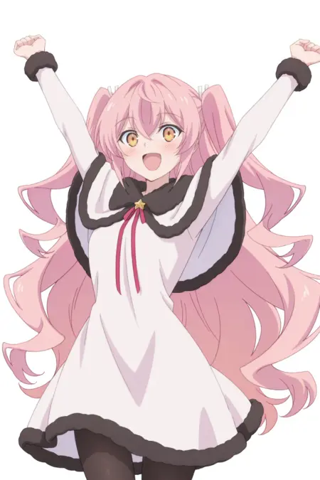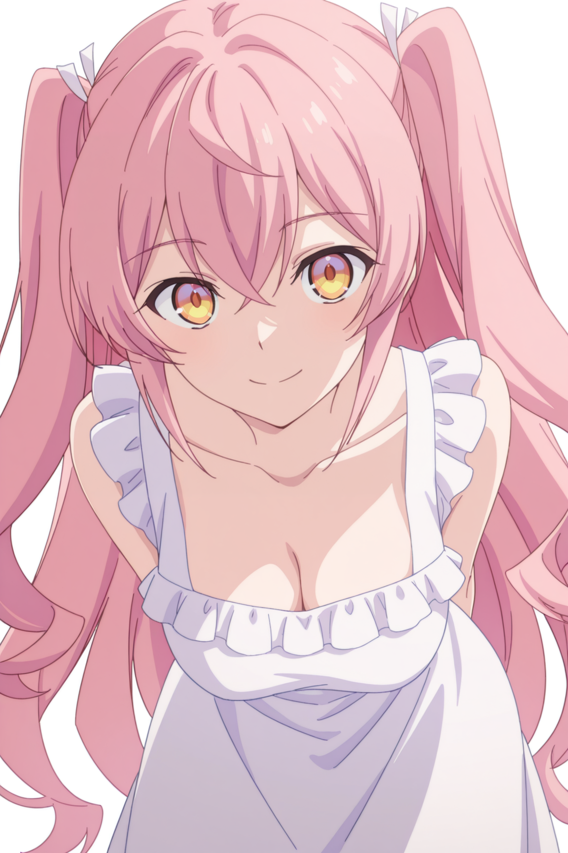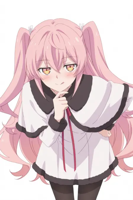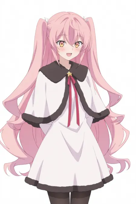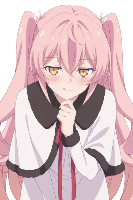 シスベル、ピンク髪、額に髪が垂れている、ツーパート、非常に長い髪、琥珀色の瞳、髪リボン