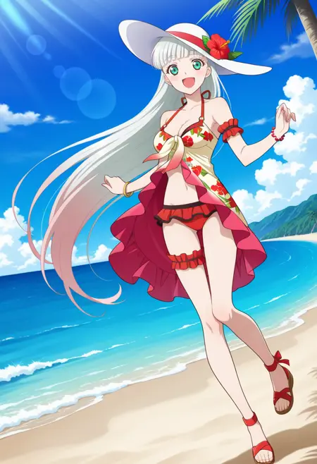 lailahrnd, gradient hair, silver hair, aqua eyes, straight hair, very long hair, blunt bangs, sun hat, white headwear, braid,