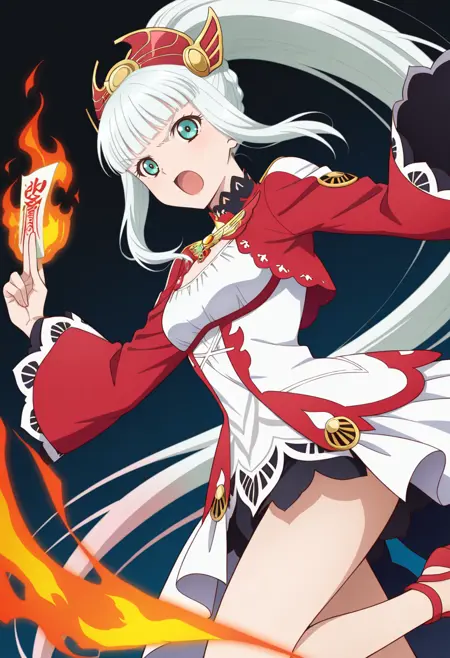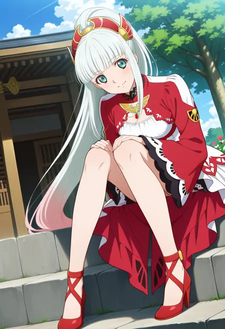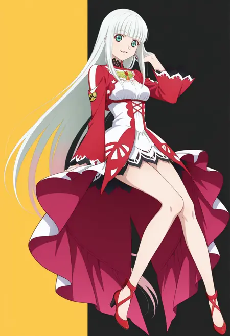 laced collar, breast cutout, jewelry, sidelocks, white dress, red dress, multi-colored dress, long sleeves, red sleeves, wide sleeves, white overskirt,